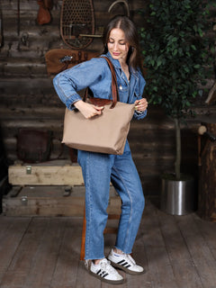 Dış yüzeyinde kullanılan suya dayanıklı kanvas kumaş, doğal dokusuyla uzun ömürlü bir kullanım sağlar. Detaylardaki hakiki deri parçalar ise çantaya sofistike bir hava katar.