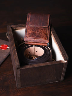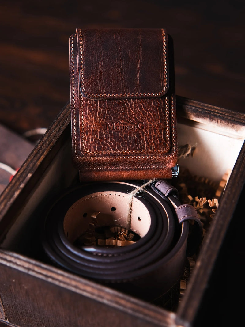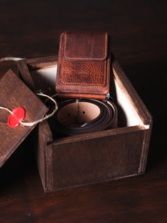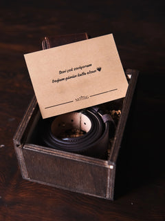 "Magnesia" Para Klipsli Deri Cüzdan + Hakiki Deri Kemer + Deri Anahtarlık + Rustik Özel Ahşap Kutu