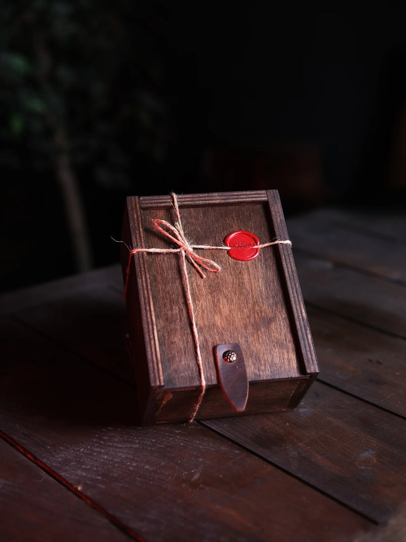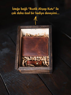 Doğal ahşap dokusu, keten ip sarımı ve kırmızı mum mührüyle eline aldığın anda kaliteli bir hediye hissi verir. İçindeki kraft dolgu, ürünün kutuda güvenle ve estetik şekilde durmasını sağlar.